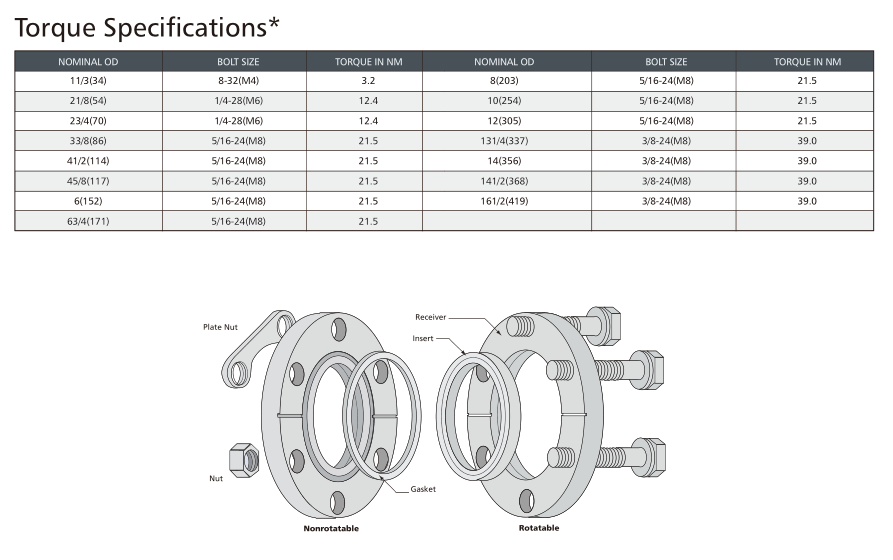 CF flanges are available with tapped or untapped holes. Tapped flanges are available in UNCUNf or metric threads. Tapped tlanges have through holes, so bolts may protrude slightly from the back of the flange when fastened to an untapped flange. Untapped Cf flanges can be fastened to each other with stainless steel bolts and hex nuts or plate nuts. Plate nuts center themselves over two adjacent holes and can be held in place with one finger while the bolts are tightened. They are avallable for most flange sizes from 1 1/3 to 10 inch (33.96-254mm) ODs. As an alternative to hex head bolts, 12-point bolts are available for CF flanges from 2 3/4 to 10 inch (33.96 to 354mm) ODs. Silver plated bolts eliminate the need for anti-seize compoundin clean room environments.