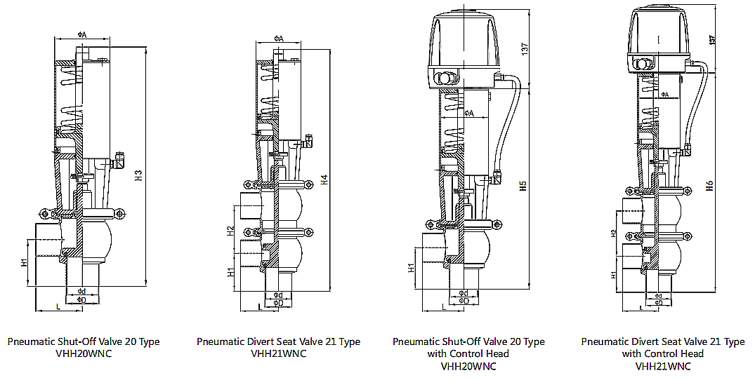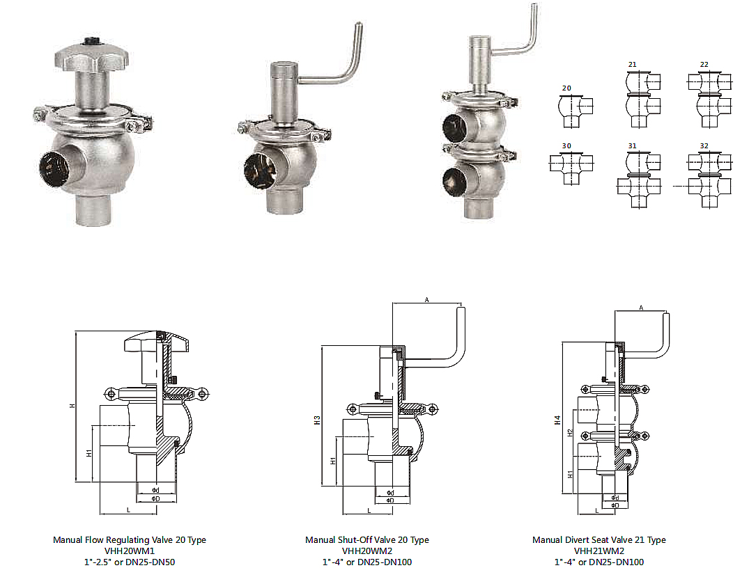 材料: 其他钢制部件:SS304 座圈密封件:EPDM、FKM,符合FDA 177.2600标准 连接方式:夹紧端/现场端/公头 体型:20、21、30、31、22、32 | ||||
