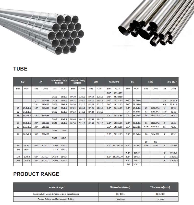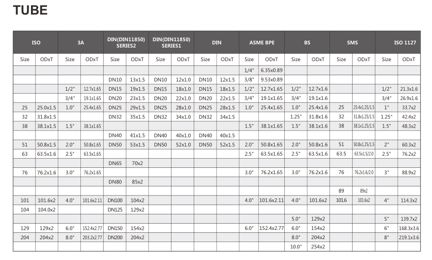 We stock all sanitary tube sizes from 1/2” (12.7 mm) to 6” (150 mm) OD in 6M (236 inch) standard lengths. Custom lengths and sizes are available upon request.