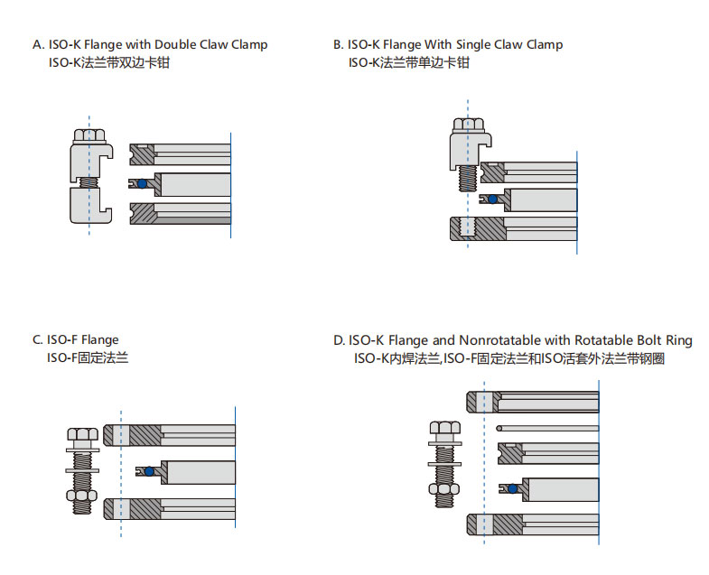 There are two different methods to join the flanges together:1. Bolts (ls0-f see diagram C) or 2. Claw clamps (ls0-k, see diagram A). These two flanges look very different, yet they can be joined together by using a single claw clamp (see diagram B).