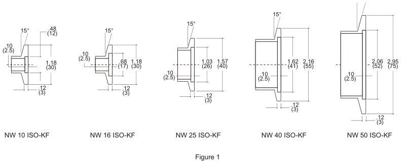 The ISO-KF system is a modular, building block method ofcreating a piping system. There are several advantages in the use of ISO components. Since component dimensions are standardized, elbows,tees, crosses or valves for a given size may be interchanged. The flanges are ''sexless'' and the seal is symmetrical, so that the components are rotatable. By using ISO components, system assembly is quick and cost effective. See Figure 1 for the ISO dimensions of flange sizes 10, 16, 25, 40 and 50. These dimensions apply to ISO-KF flanges of these nominal diameters throughout this catalog.