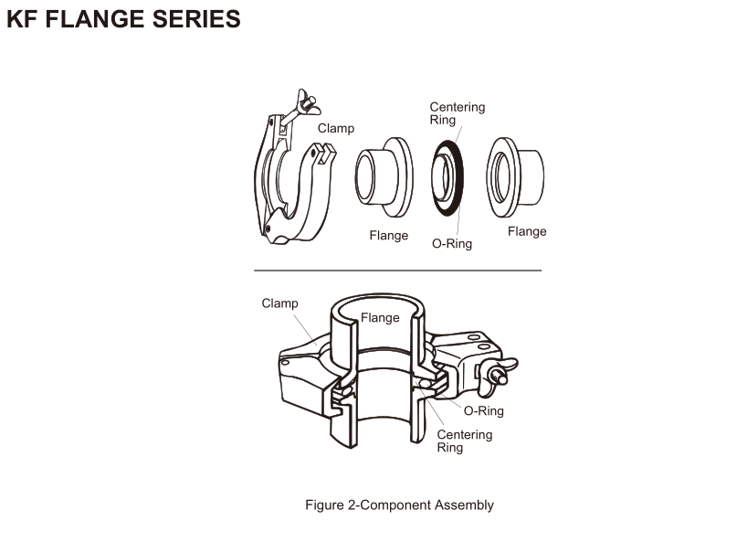 The ISO-KF components are assembled by inserting a centering ring between the two flange faces, then securing the assembly with a flange encompassing clamp (see Figure 2).