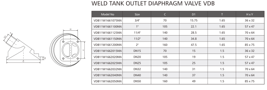 查询VDB series is a sanitary diaphragm valve is specially designed for using on food, beverage, dairy, brewing, pharmaceutical industries, etc. It is excellent for flow control as well as for open/close duties.