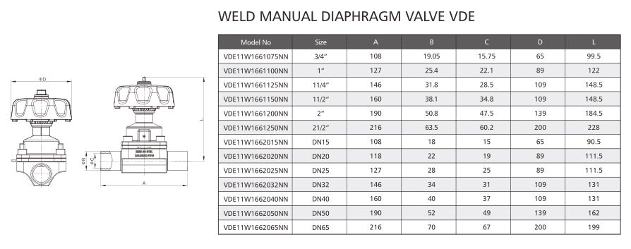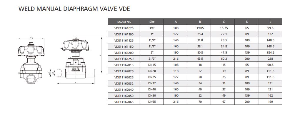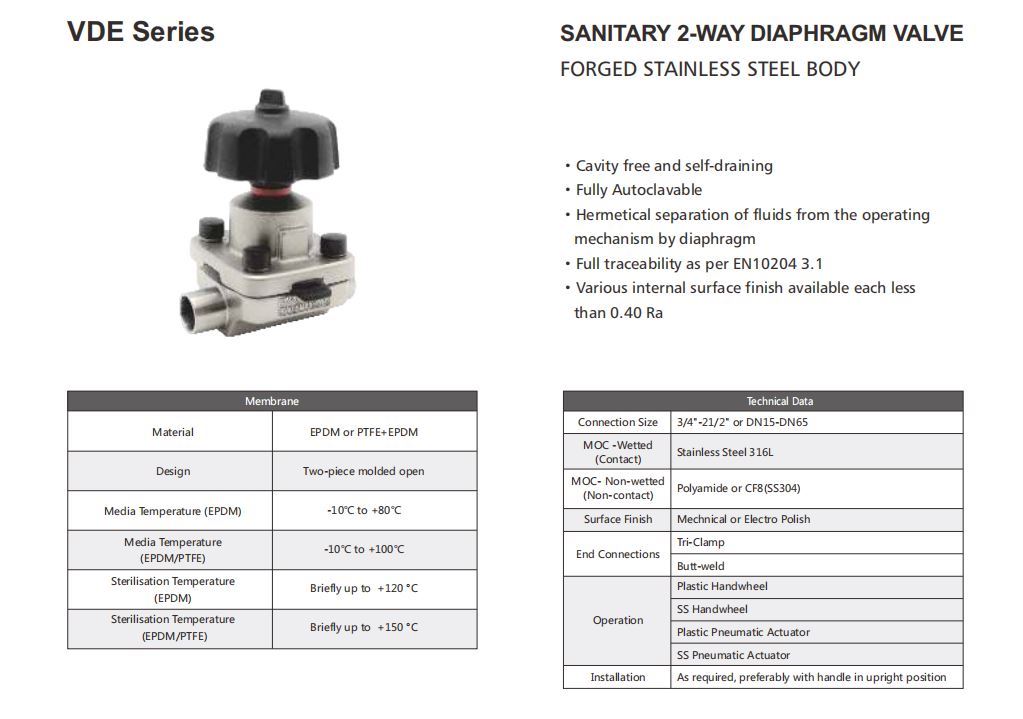 查询VDE series diaphragm valve with forged body, specially designed for using on food, beverage, dairy, brewing, pharmaceutical industries, etc. It is excellent for flow control as well as for open/close duties.