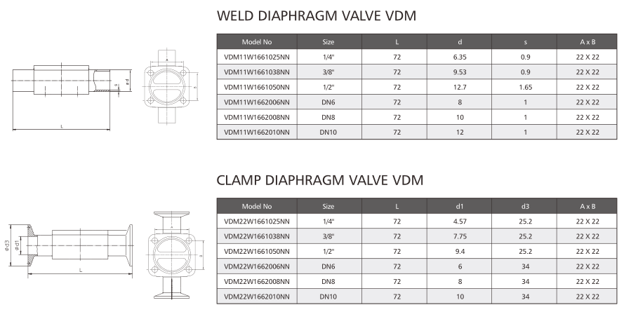 查询VDM mini type diaphragm valve, specially designed for using on food, beverage, dairy, brewing, pharmaceutical industries, etc. It is excellent for flow control as well as for open/close duties.