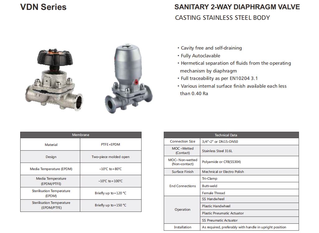 VDN series is a sanitary diaphragm valve , specially designed for using on food, beverage, dairy, brewing, pharmaceutical industries, etc. It is excellent for flow control as well as for open/close duties.