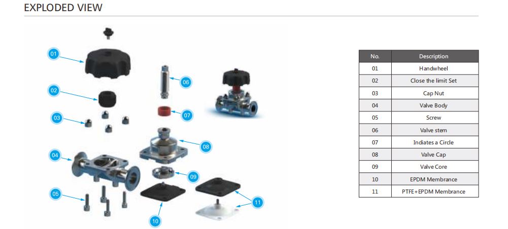 The seal materials comply with FDA177.2600 standard. Using proprietary technology, the diaphragm uses a combination of EPDM and PTFE, which is secured using SS bolts. The sealing part where contact with the medium is of PTFE material, it has good cold resistance -13℉(-25℃), excellent heat-resistance 482℉ (+250℃), tolerance to most chemicals, and excellent abrasion resistance to medium flow.