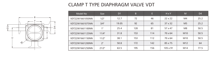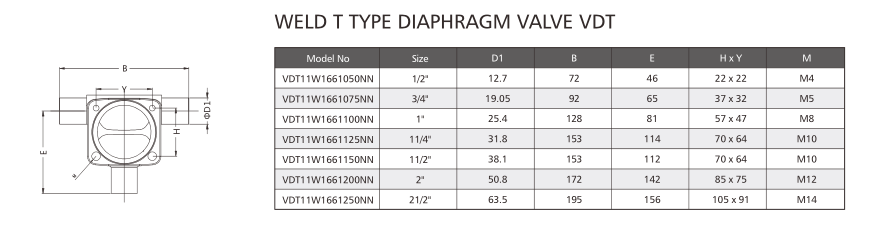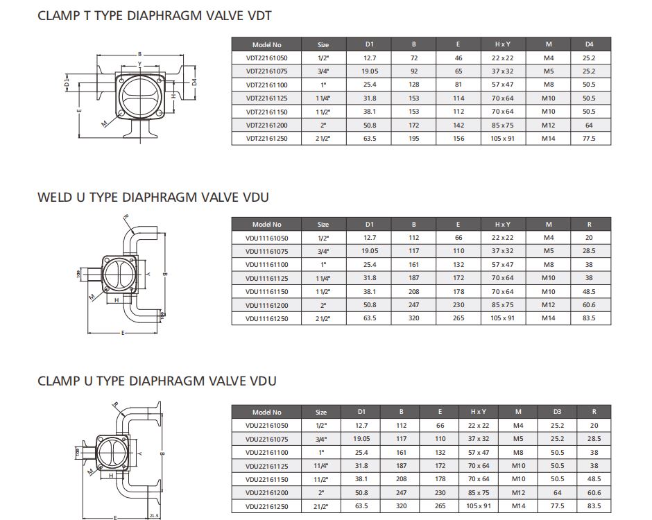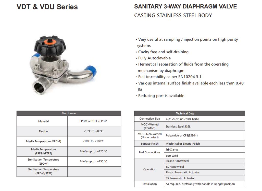 查询VDT series is a sanitary diaphragm valve with T type design, which is specially designed for using on food, beverage, dairy, brewing, pharmaceutical industries, etc. It is excellent for flow control as well as for open/close duties.