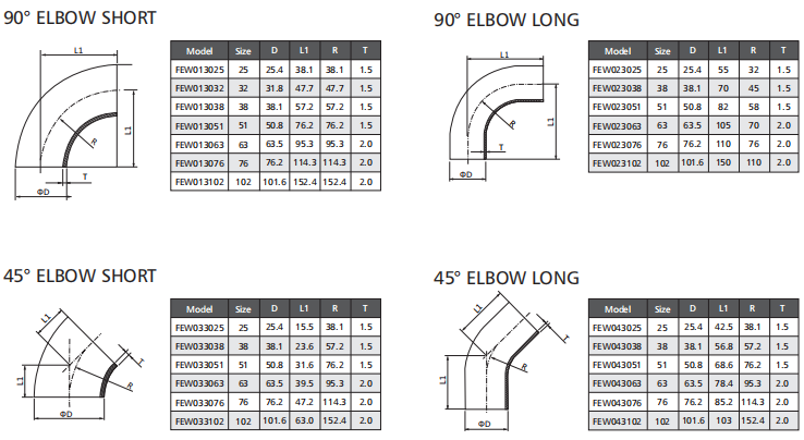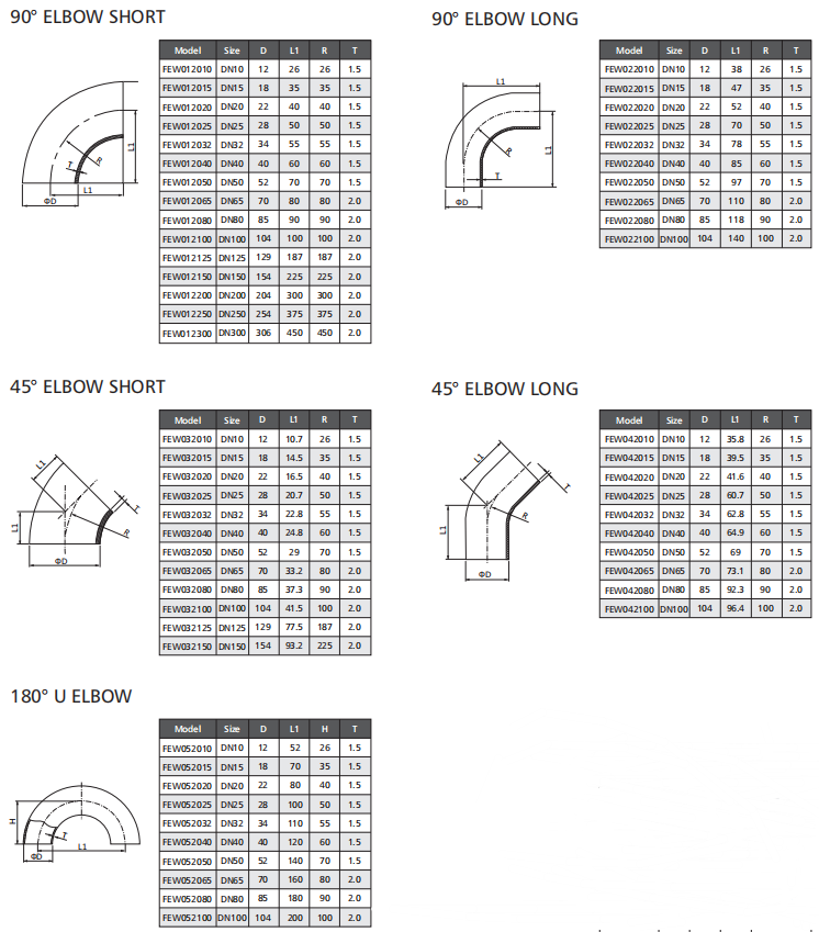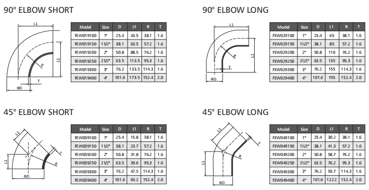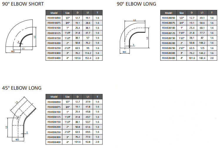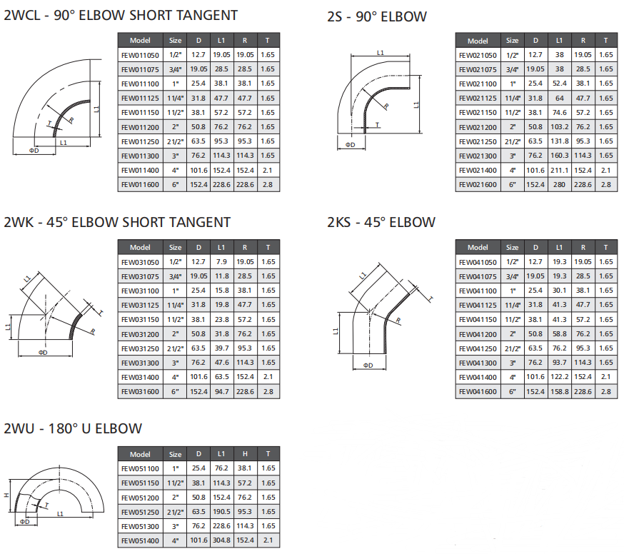 查询Weld Fittings are used on permanent installations where process piping and equipment can be cleaned in place (CIP) and removal from the system is not required. Weld Fittings are offered in nominal tube sizes 1/2˝ through 8˝ in T304 and T316L materials. Uniform wall thickness for 1/2˝ through 3˝ sizes measure .065 (16 ga). In 4˝ size, wall thickness measures. 083 (14 ga), 6˝ and 8˝ .109 (12 ga).