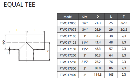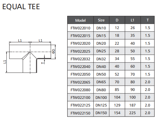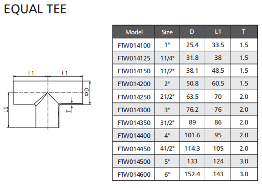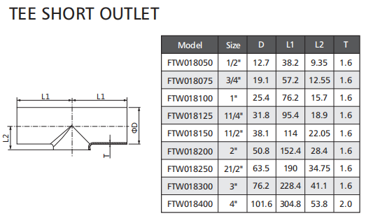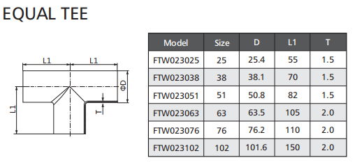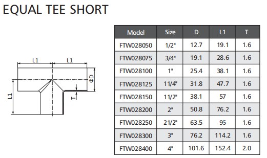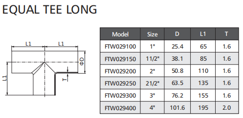 查询Weld Fittings are used on permanent installations where process piping and equipment can be cleaned in place (CIP) and removal from the system is not required. Weld Fittings are offered in nominal tube sizes 1/2˝ through 8˝ in T304 and T316L materials. Uniform wall thickness for 1/2˝ through 3˝ sizes measure .065 (16 ga). In 4˝ size, wall thickness measures. 083 (14 ga), 6˝ and 8˝ .109 (12 ga).