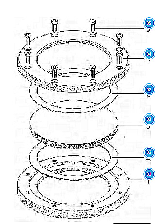 将底座法兰(1)焊接到容器壁上后,小心地放置垫片(2)、玻璃视镜盘(3)和盖法兰(4),并用螺栓(5)将其固定在一起。用套筒扳手沿直径方向交叉逐步拧紧。