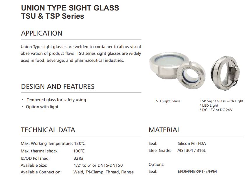 查询TSU Series union type sight glass is widely used in food, wine-producing, beverage and pharmacy industries etc. For it is convenient to view the condition of equipment running state and system work state.