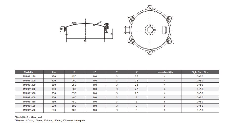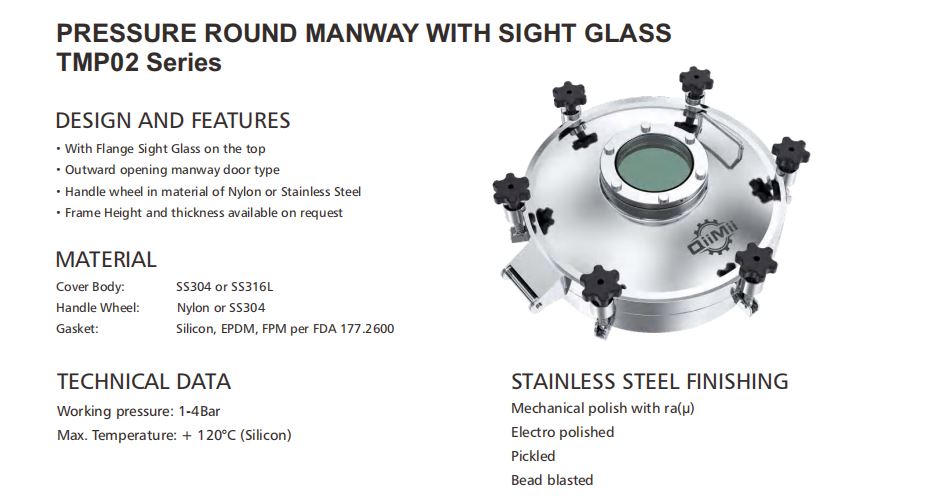 查询TMP02 Series manhole cover is used on tanks or containers, especially in the dairy industry, where a hygienic closeable mean of access and monitoring to the interior of the tank required.