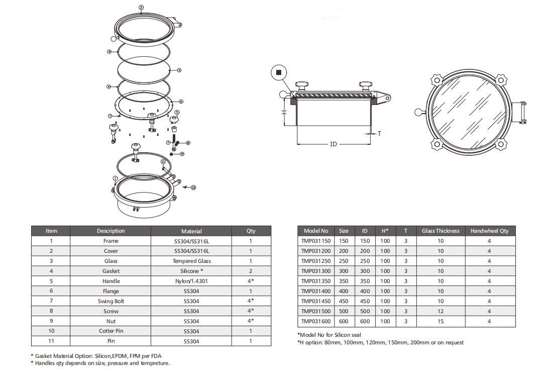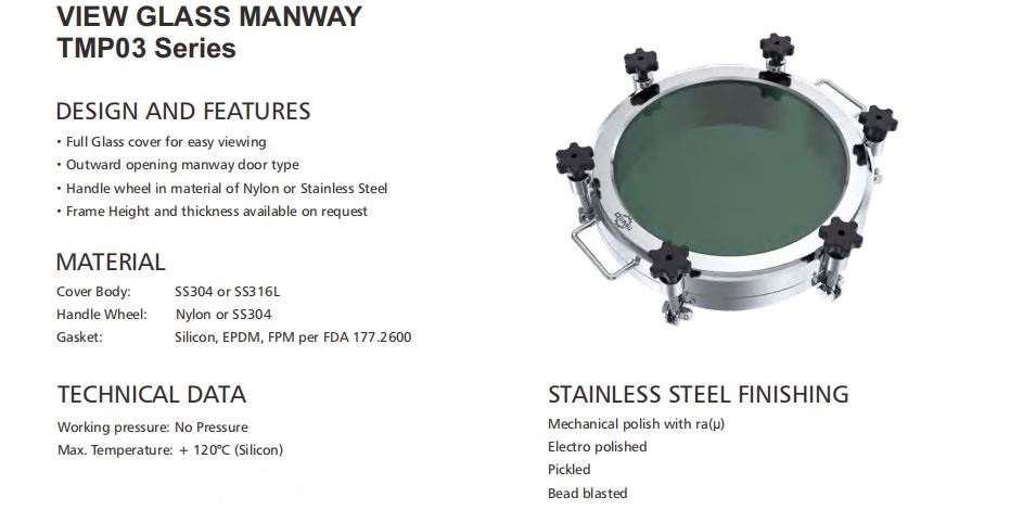 查询TMP03 Series manhole cover is used on tanks or containers, especially in the dairy industry, where a hygienic closeable mean of access and monitoring to the interior of the tank required.
